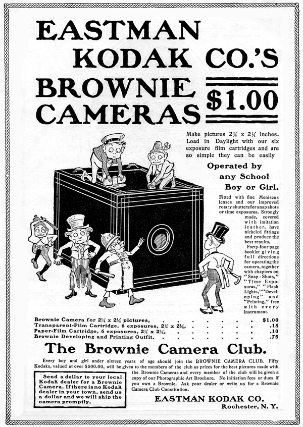 එතෙක් දැවැන්ත කැමරා ලෙසින් තිබූ උපකරණය අතේ තබාගෙන පින්තූර ගත හැකි තරමට කුඩා විය. ඡායාරූප කලාවේ සහ තාක්ෂණයේ යෝධ පියවරක් තබමින්, වර්ෂ 1900 පෙබරවාරි මාසයේ දී කොඩැක් සමාගම විසින් පෙට්ටි කැමරාව ලොවට දායාද කළෝ ය. කොඩැක් බ්රවුනි Kodak Brownie නම් වූ එය අතිශය සරල මේ කැමරාව ඉතා ඉක්මණින් වැඩි දියුණු විය. මුලින් ම එම කැමරාව අලෙවි කළේ පවුම් 01ක මුදලකට ය. යොදන්නේ අඟල් 2 1/4 රාමුවක් සහිත 117 පටලපට ය.